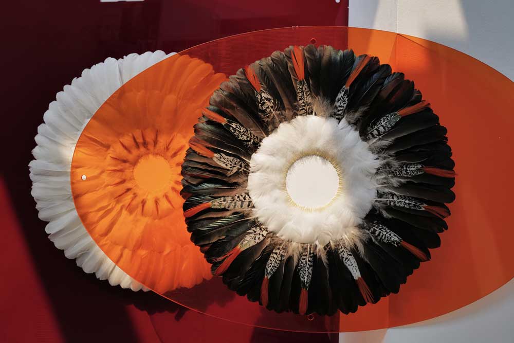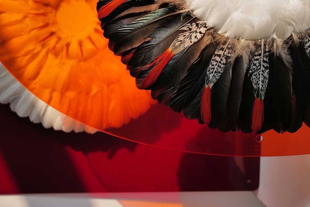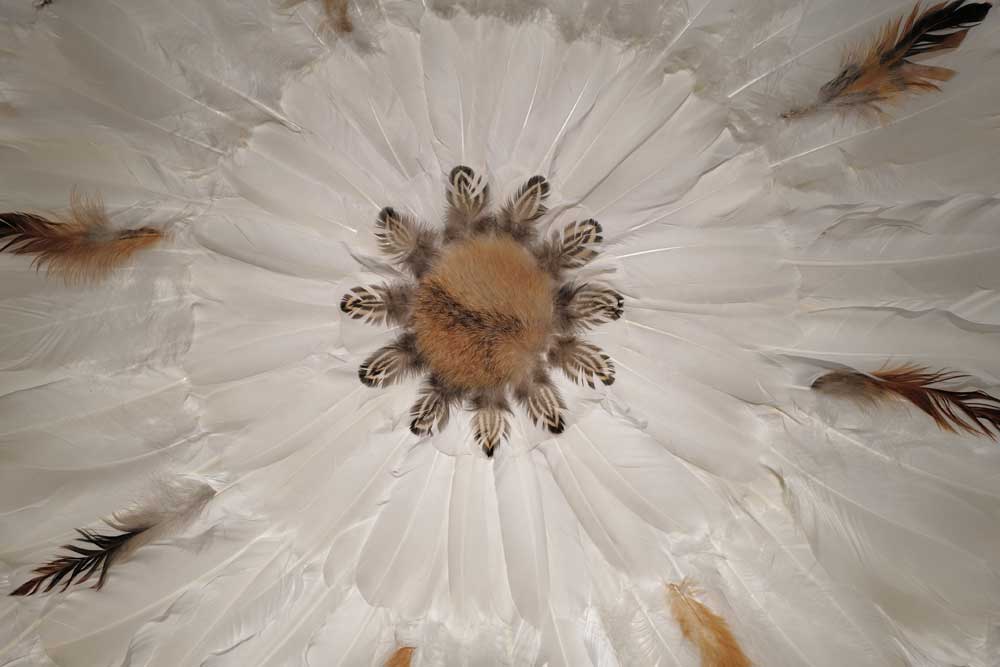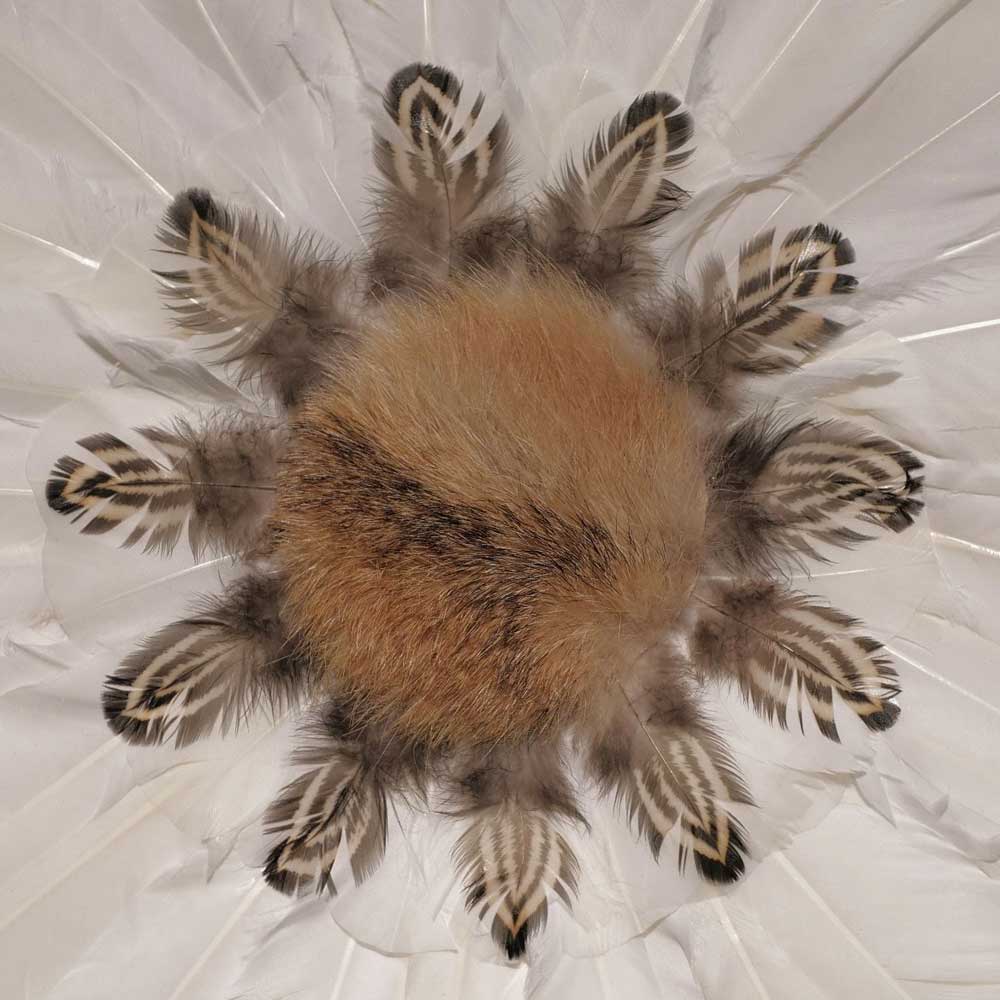 Die Federkreise entstehen intuitiv und inspiriert durch Material, Persönlichkeit des Empfängers oder auch des Bestimmungsorts. Die Federn schmiegen sich übereinander, mit Blattgold werden Lichteffekte eingefangen und Materialien wie Baumrinde oder Tierfelle stellen eine weitere Verbindung zur Natur her.
