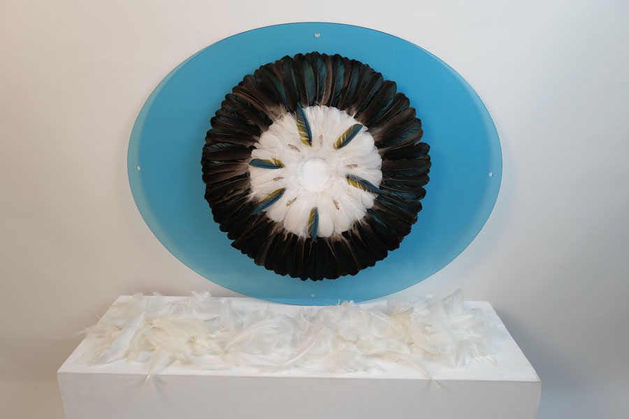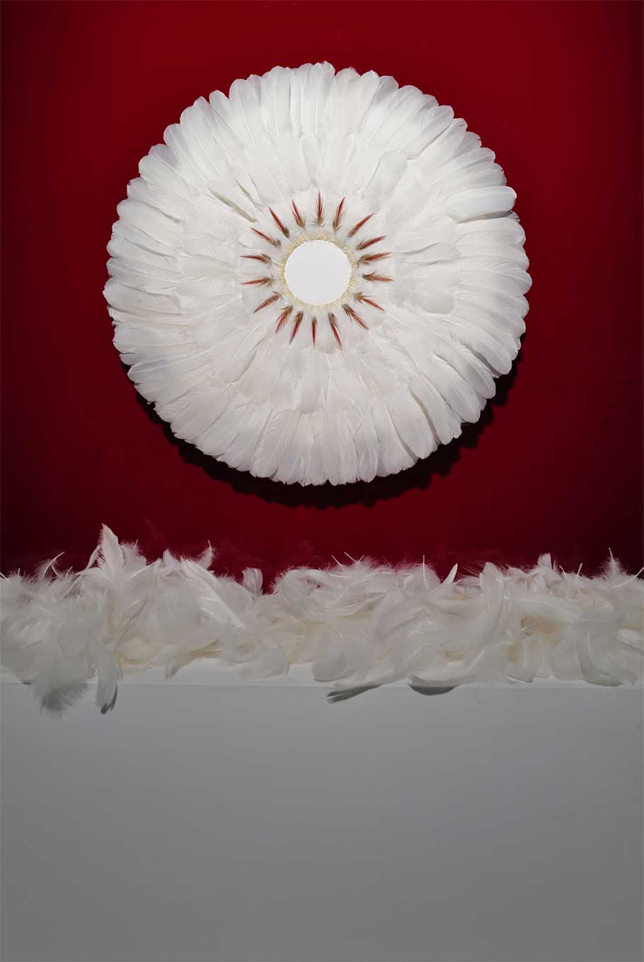 Auf knalligen Farben kommt die neue Serie der Federkreise daher. Sie verbindet Frische mit Zartheit. Das feine Spiel der Federn gewinnt auf geometrischer Form besondere Aufmerksamkeit.